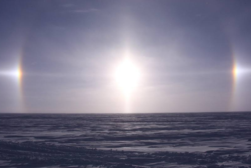 幻日(sun dogs)是大氣的一種光學現象。在天空出現的半透明薄云里面,有許多飄浮在空中的六角形柱狀的冰晶體,偶爾它們會整整齊齊地垂直排列在空中。當太陽光射在這一根根六角形冰柱上,就會發(fā)生非常規(guī)律的折射現象。